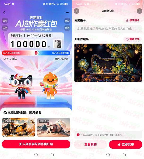 小编提示:打开淘宝APP搜索【猫淘大战】进去,进去选择战队,然后再一键AI生成并发布,等晚上19:00之后再回到活动里瓜分红包,金额随机,每天10万元