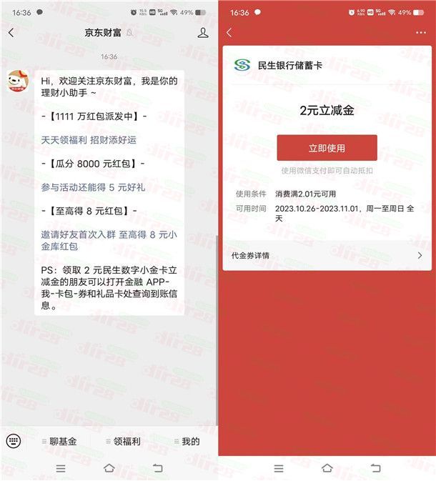 这个活动需要之前在京东金融小金库注册开通过民生银行电子卡的可以去(如果不是在京东金融小金库开通的民生银行电子卡的不要去),通过微信搜索公众号【京东财富】关注后,就会直接到账2元民生银行微信立减金,无需手动领取,直接到账微信卡包里,这个立减金只能是在京东金融小金库开通的民生银行电子账户才可以抵扣。