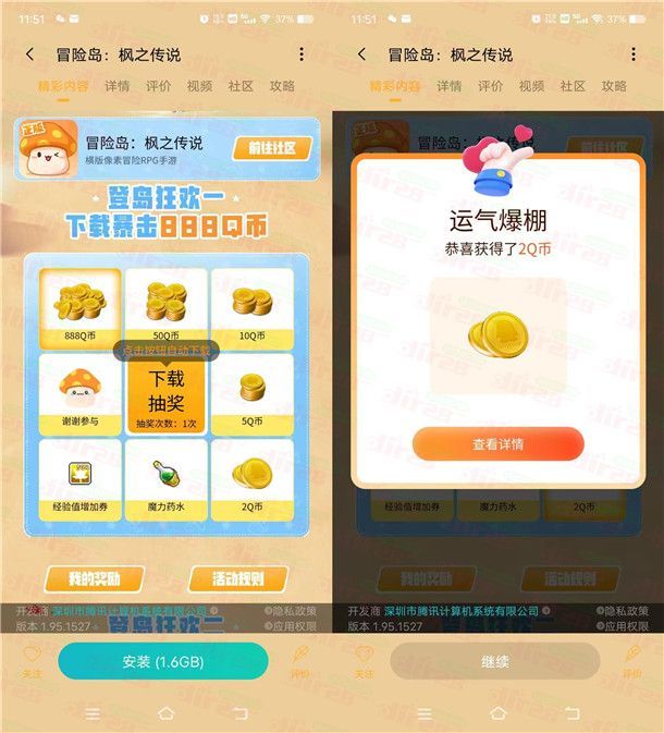 小米游戏中心冒险岛枫之传说抽2-888个Q币 亲测中2Q币