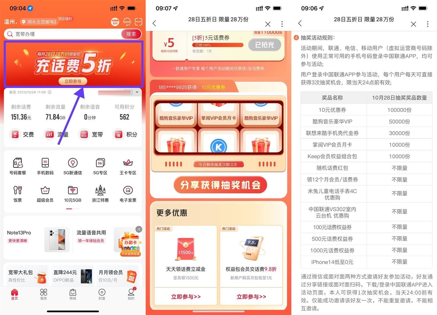 联通APP首页“充话费5折”->下拉有3次机会,抽酷狗、Keep会员等权益