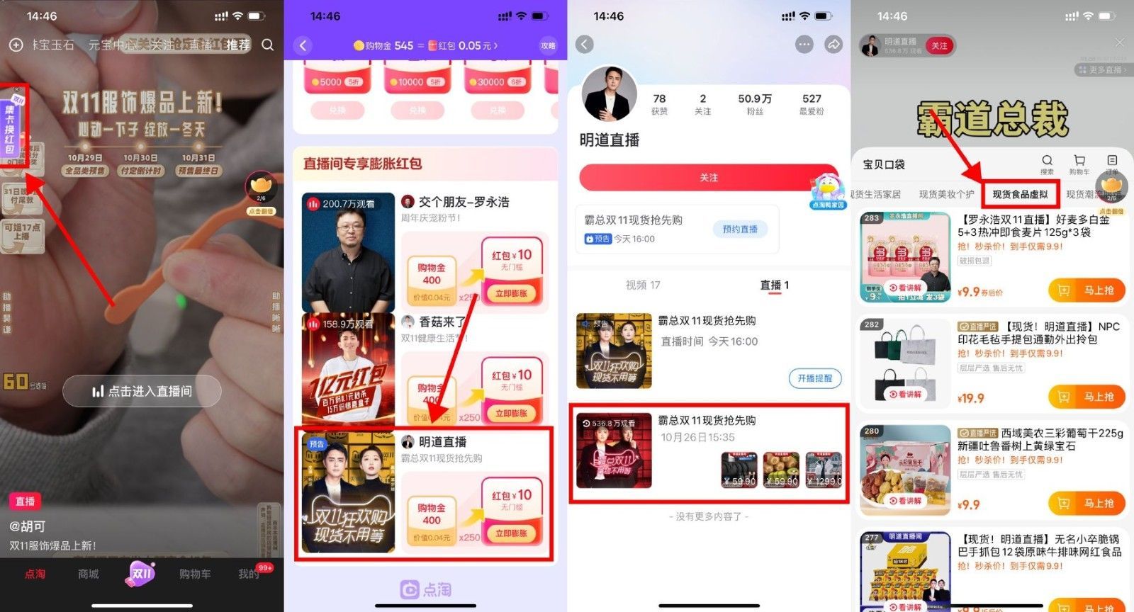 点淘APP左侧“集卡换红包”->简单浏览得购物金,满400购物金兑换明道直播10元红包,找到直播回放点进去,买10元以下的实物即可