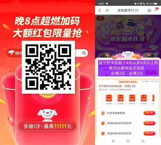 今天20点整京东双11加码超级红包 必得2元以上红包