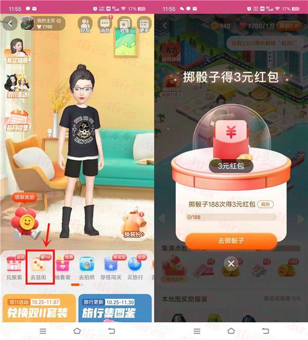 小编提示:打开淘宝APP搜索【淘宝人生】进去点击【去逛街】每天完成指定的任务得骰子,累计掷骰子达188次领3元通用购物红包
