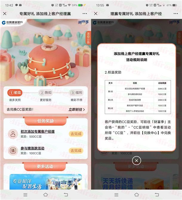 小编提示:需要之前没添加过专属客户经理的才可以参加(如果进去提示不是受邀就参加不了),首次添加客户经理领500CC豆,猜跌涨100CC豆,完成问卷200CC豆,报名提升资产100CC豆,报名个人养老金100CC豆,合计最多1000个CC豆(价值10元),CC豆可以兑换京东卡、天猫超市卡等等