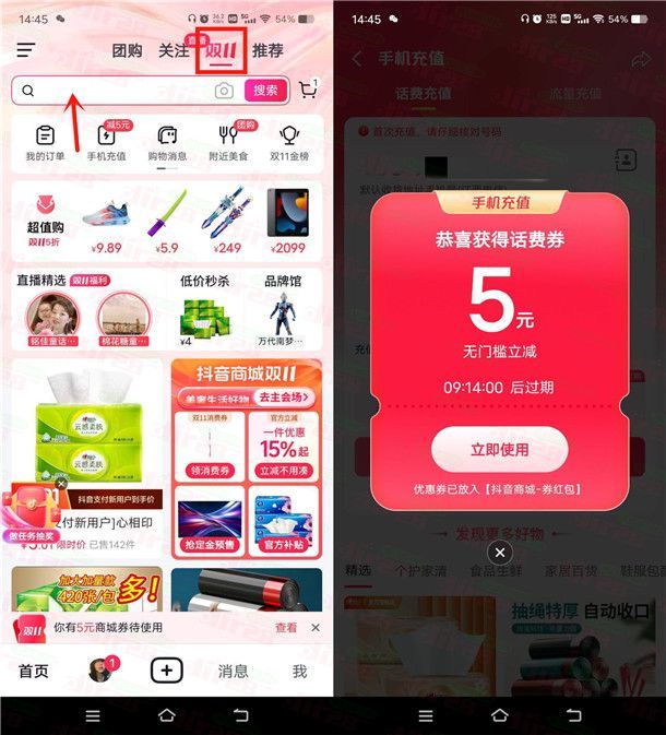 1、打开抖音APP,点底部图标【双11】进去,再点击【手机充值】进去会自动弹窗提示获得5元话费券(如果没有获得就参加不了)