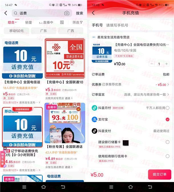 抖音商城领取5元话费券 可5充10元手机话费 亲测秒到账