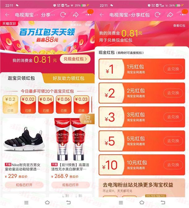 淘宝双11电视淘宝每天领20个随机红包 累积满1元兑换