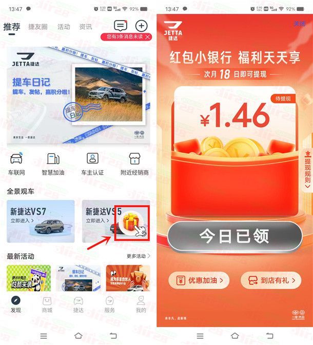 2、打开捷达APP,登录账号后,点APP底部【发现】再点右侧礼物图标进去活动里