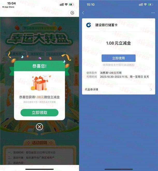 参加裕农通举办的幸运大转盘抽最高88元微信立减金活动,这个活动注册裕农通的可以去,不限制地区,通过打开裕农通APP进去活动里,先在首页左上角将地区手动修改为“广西”任意地区,再点击中间图片“幸运大转盘”进去活动里,有机会中到1-88元微信立减金,中到的微信立减金全国建行卡都可以抵扣。