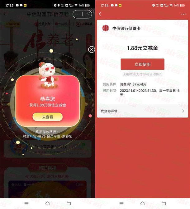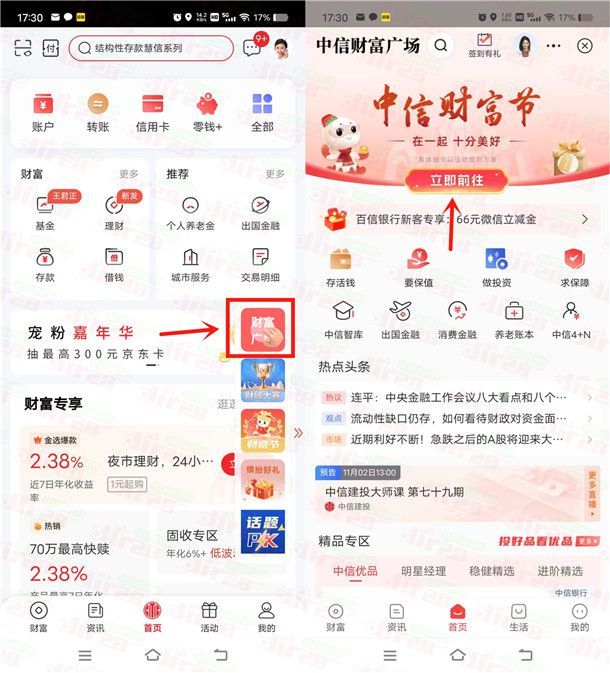 中信银行财富节简单浏览抽1-888元微信立减金 亲测中1.88元