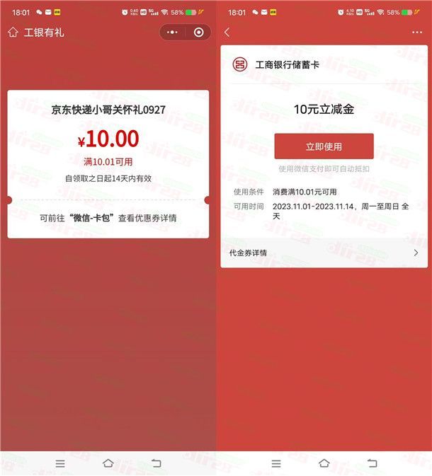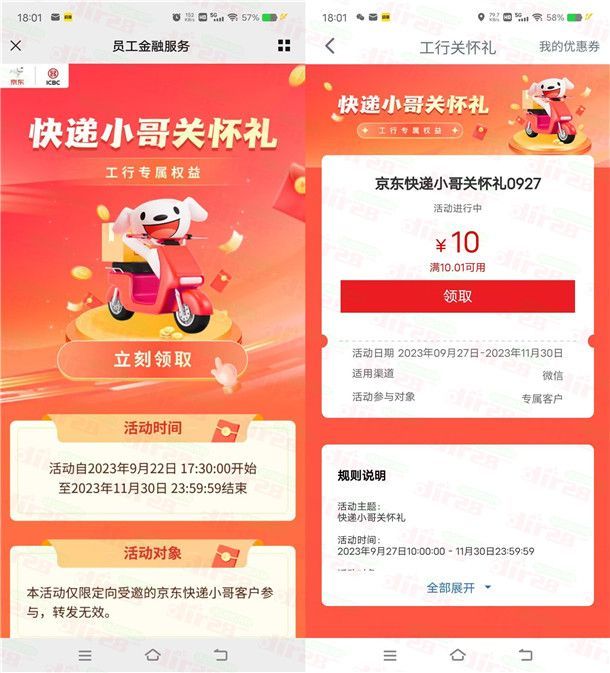 参加工行举办的快递小哥关怀礼活动,通过打开微信或者手机浏览器进去活动里,进去填写手机号码参加,然后再跳转到中国工商银行APP活动里,就可以领取到10元微信立减金,如果跳转不过去,填了手机号码后再打开中国工商银行APP搜索“工行消费季”进去领取,小编测试领到的微信立减金秒到,数量限量。