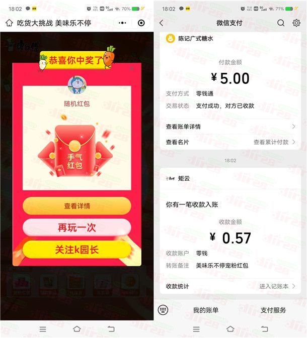 参加康师傅举办的吃货大作战小游戏抽红包活动,通过打开微信进去小程序活动里,只要在小游戏中分数达到200分就可以进行抽奖,每个微信每天可以抽奖3次,有机会中到随机金额的微信红包、实物,小编测试中到0.57元秒推,非必中。