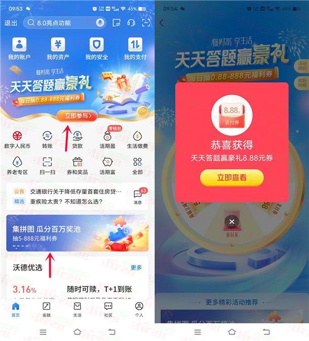 交通银行答题和集拼图抽0.88-888元支付券红包 亲测中8.88元
