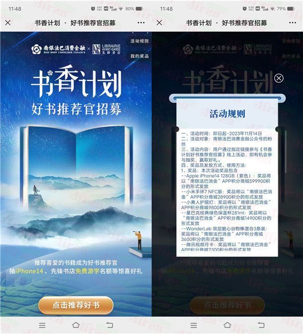 参加参加南银法巴消费金融举办的书香计划好书推荐官招募活动,通过打开微信进去活动里,在活动里随便填写一本书提交后就可以抽奖1次,有机会中到京东卡、天猫超市卡、以及各种卡券,不管中到什么,中到的奖品以等值的积分到账,可以在APP里兑换京东卡、天猫超市卡等等,非必中。
