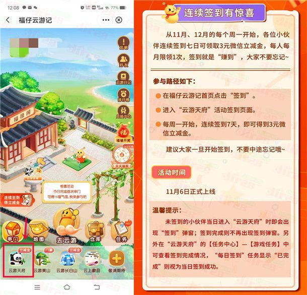 这是中国银行福仔云游记中的云游天府的签到活动,是一个新活动,通过打开中国银行APP搜索“福仔云游记”进去,点“云游天府”进去点击弹窗签到就算完成1天签到(如果当天签到了就不会再有弹窗签到),连续签到7天可以领到3元微信立减金,领到的微信立减金全国中国银行卡都可以抵扣,也可以变现。