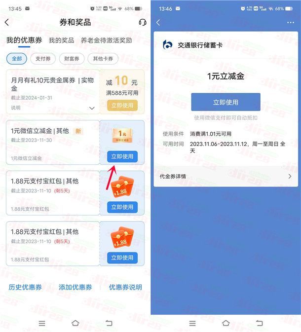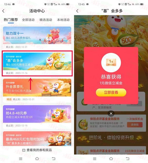 交通银行基会多多收好礼抽1-500元微信立减金 亲测中1元