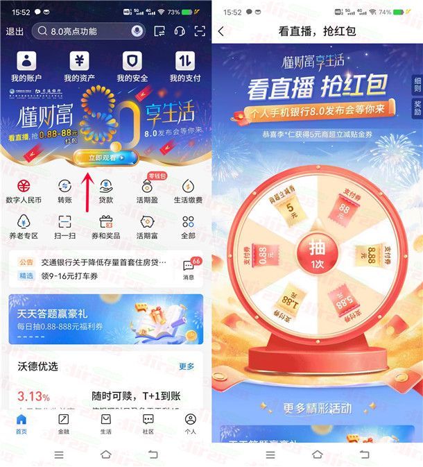 交通银行看直播抽0.88-88元支付券红包、5元商超立减券