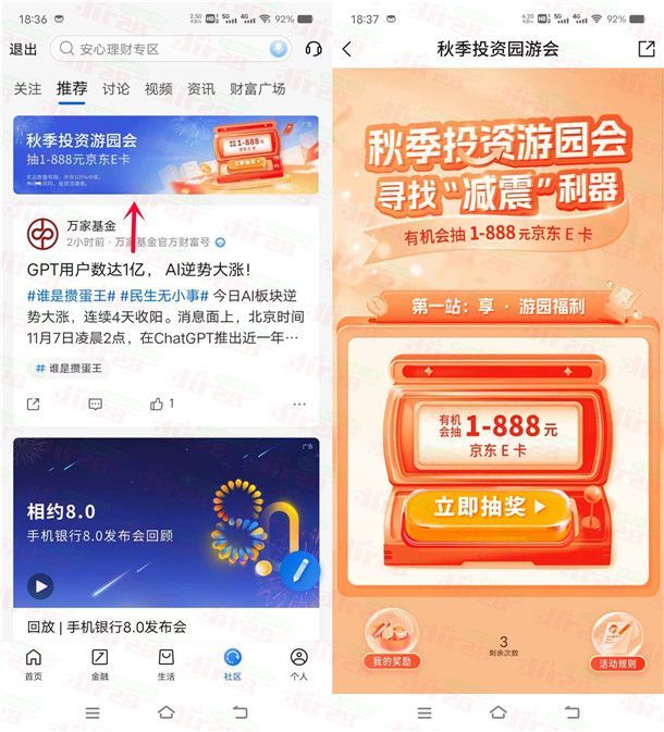 参加交通银行举办的秋季投资游园会简单任务抽京东卡活动,通过打开交通银行APP进去社区页面点击顶部滚动图进去活动里,下拉页面完成3个简单的任务就可以抽奖3次(关注+收藏+右上角分享),有机会中到1-888元京东卡,中到的京东卡可以自用也可以出售卖给别人,非必中。