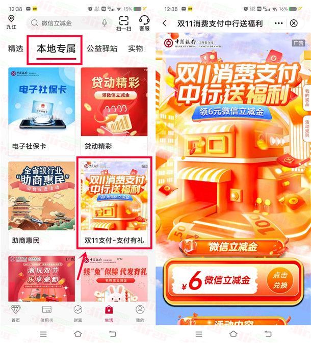 小编提示:打开中国银行APP,点底部【生活】,下拉页面点击【本地专属】再点“双11支付-支付有礼”进去,可以直接领到6元微信立减金,需要江西中国银行才可以领取,数量限量