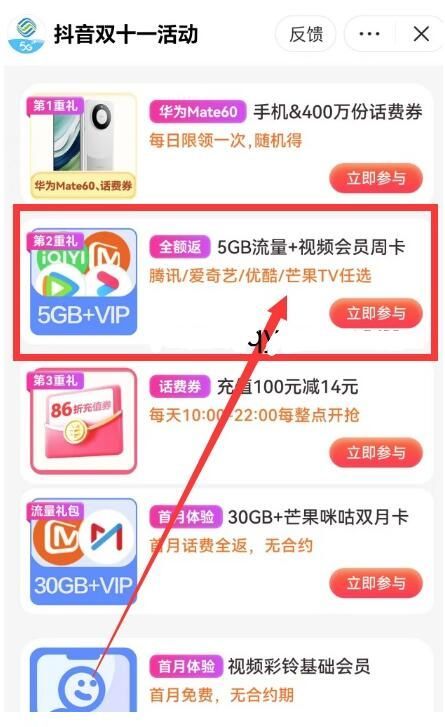 移动免费领5GB流量+视频会员周卡4选1,抖音扫码进入活动点【5GB流量+视频会员周卡】进入领取使用10元话费办理,办理成功后会赠送10元话费券,在移动APP我的卡券里使用话费即可。