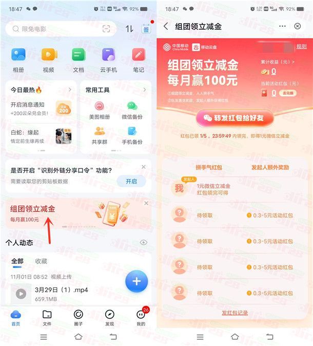 移动云盘5人组队领0.3-5元支付宝红包、1元微信立减金