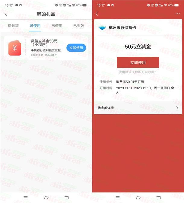 杭州银行签到打卡赢好礼抽1-100元微信立减金 亲测中50元