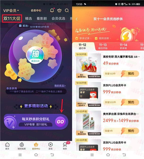 小编提示:需要有爱奇艺会员的才可以,打开爱奇艺APP,点底部【会员中心】,再点顶部【双11大促】下拉页面点【每天秒杀积分好礼】进去,每天10点、12点、18点、20点整可以用999个积分兑换1年京东PLUS会员,每场限量500份