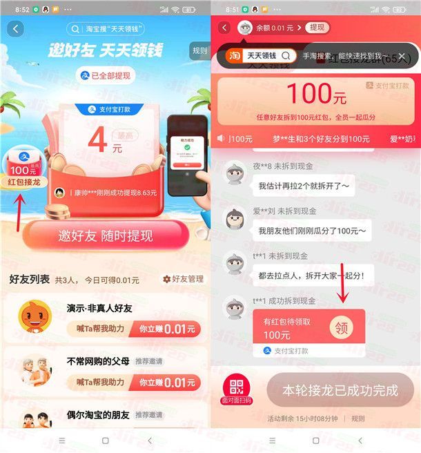 立即参与:打开淘宝APP搜索【天天领钱】进去点左侧【红包接龙】进去参加