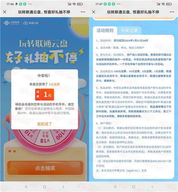 联通云盘好礼抽不停抽1-100元手机话费 亲测中1元秒到