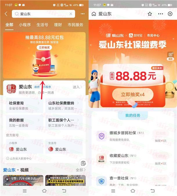 参加支付宝举办的爱山东社保缴费季抽最高88.88元支付宝红包活动,通过打开支付宝APP搜索【爱山东】进去活动里,在活动里完成4个简单的浏览任务可以抽奖4次,有机会中到0.88-88.88元支付宝红包,小编测试中到0.88元秒到支付宝卡包里。