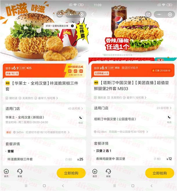 美团6.9元买华莱士全鸡汉堡3件套、塔斯汀汉堡2件套