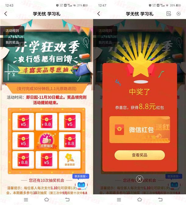 参加农行举办的爱无忧学习礼开学狂欢季抽红包活动,这个活动全国都可以去,但是只有部分用户才可以参加,通过打开中国农业银行APP进去活动里,每支付1.1元可以抽奖1次(也可以用二类电子卡付,会30分钟后原路退回,不会反撸),第3次必中5元,第10次必中8.8元,中到的红包按照提示领取就会推送。