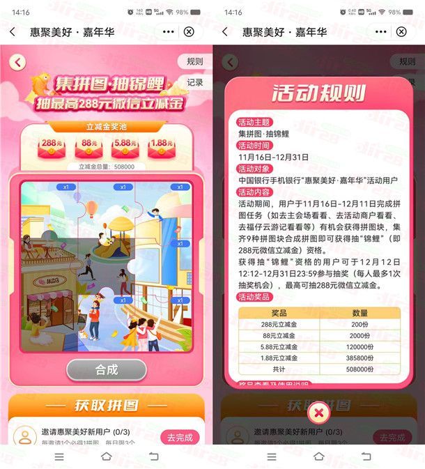 参加中国银行举办的惠聚美好嘉年华集拼图抽锦鲤赢最高288元微信立减金活动,通过打开中国银行APP进去活动里,每天完成页面指定的任务可以获得多张拼图(不邀请好友做一天的任务集不齐,任务每天都可以去做),集齐完成的拼图就可以合成抽1.88-288元微信立减金,微信立减金一共有50万份。