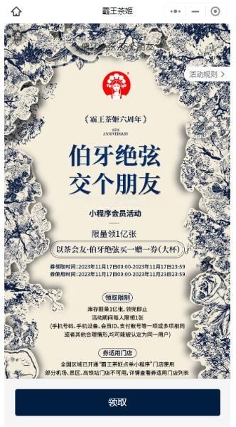 霸王茶姬6周年领伯牙绝玹买一送一券,是大杯的,有要喝的可以去领一手。