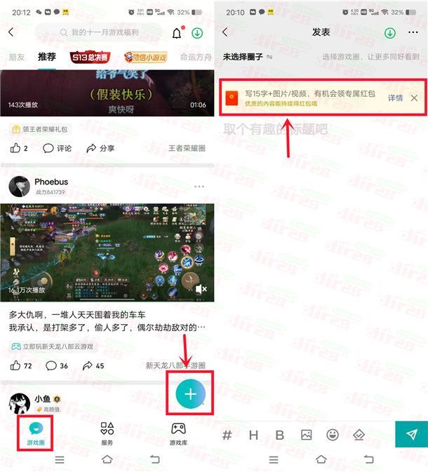 2、在游戏圈页面下拉一下,点击右下角的+号,先上传一张图片,然后提示你“写15字+图片/视频有机会领专属红包”就可以参加(如果没有这个红包提示就换个微信看看)