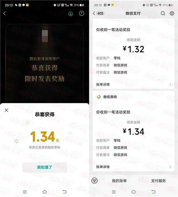 微信游戏圈的一个简单的活动,通过打开微信进去游戏圈页面,点击右下角的+号随便写15个文字以及上传一张图片提交后就可以点击弹窗抽1次红包,每个微信可以领到2个红包,小编测试领到1.32元+1.34元红包秒推,红包直接推送微信零钱,也有好友中好几块的红包。