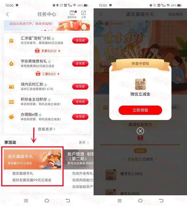工行悦享生活情暖初冬抽1.99-99元微信立减金 亲测中1.99元