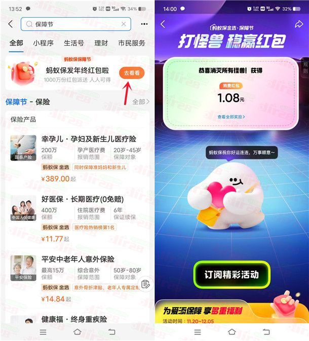 参加支付宝举办的蚂蚁保金选保障节打怪兽抽最高188元红包活动,通关打开支付宝APP搜索【保障节】进去活动里,在活动里完成指定的浏览任务可以获得毒刺消灭怪兽的机会,每次消灭怪兽有机会得到红包,一共有3关小游戏,小编测试3关全部通关累积得到1.08元支付宝消费红包。