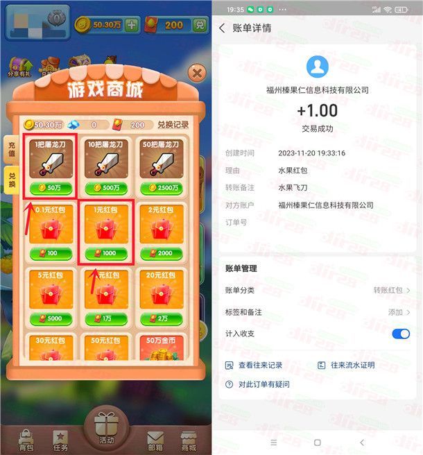 又来一个简单的撸1元现金红包的活动,只能安卓手机参加,通过下载打开水果飞刀app客户端,用微信登录后先在游戏里随便玩几分钟累积得到50万金币就行,然后用50万金币去兑换1把屠龙,再去活动里消耗1把屠龙抽奖,一般都会得到1000鸡蛋左右,然后用1000鸡蛋去兑换1元现金红包,兑换后秒到支付宝,只撸这个1元就行,其他更高金额兑换不了因为需要VIP,这种游戏只要撸1元就行,别去充钱。