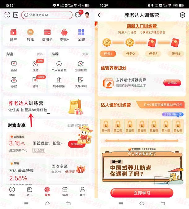 参加中信银行举办的养老达人训练营抽最高88元支付宝红包活动,通过打开中信银行APP进去活动里,下拉页面养老达人训练营和和打卡2个活动都可以做,完成4个简单的任务可以抽奖2次(点击任务3和任务4就可以分别抽奖1次),打卡的活动打卡7天抽奖,有机会中到0.18-88元支付宝红包,小编测试中到0.38元,非必中。