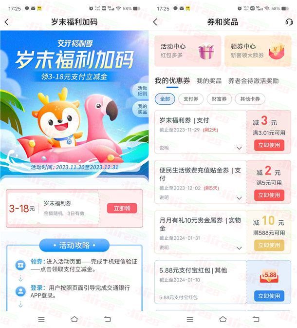 交通银行岁末福利加码活动抽3-18元支付券 亲测中3元