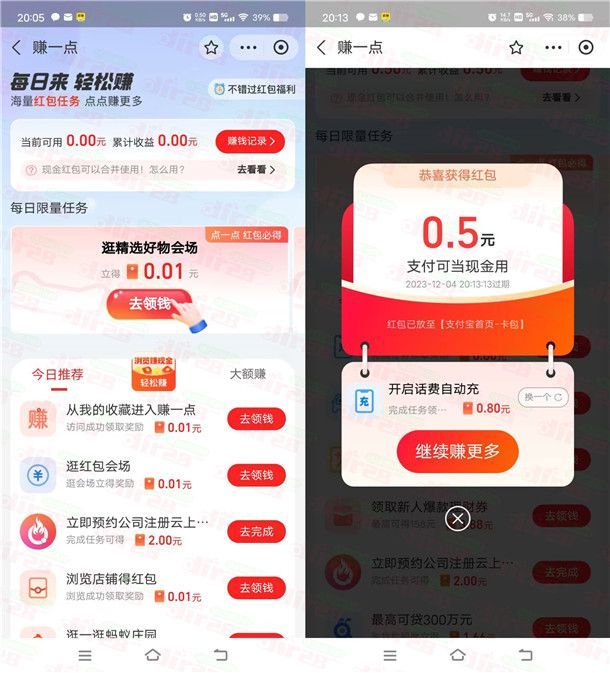 支付宝赚一点简单任务领取多个支付宝红包 亲测秒到卡包