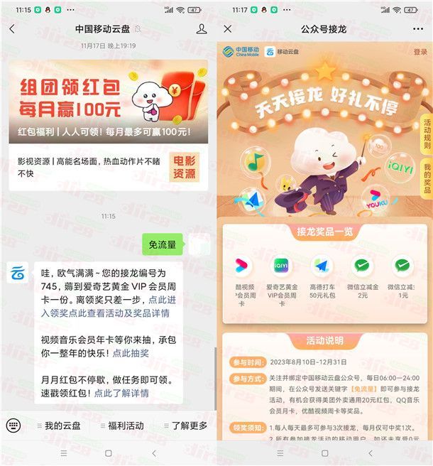 参加中国移动云盘举办的公众号天天接龙豪礼不停活动,通过打开微信关注公众号【中国移动云盘】回复【免流量】绑定手机号码接龙参加,有机会中到1-2元微信立减金、各大视频会员,小编测试中到爱奇艺会员周卡,每天3次机会,每个月只能抽1次,非必中。