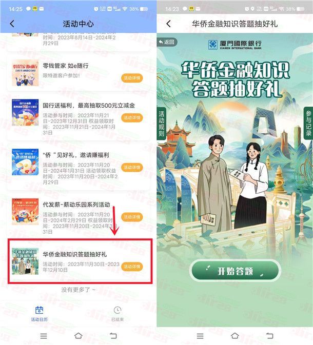小编提示:打开厦门国际银行APP,在【我的】页面点【活动中心】进去,下拉到底点【华侨金融知识答题抽好礼】进去,每天答对1道题可以抽奖,刚中1个月知乎盐选会员,中到的会员以卡密的形式到账,可以自用也可以出售(1个月知乎会员可以卖9元左右)