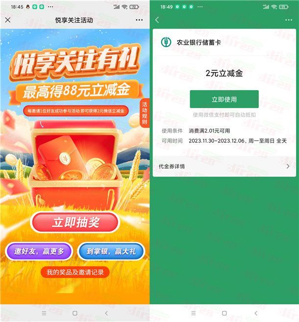农行悦享关注有礼开宝箱抽2-88元微信立减金 亲测中2元