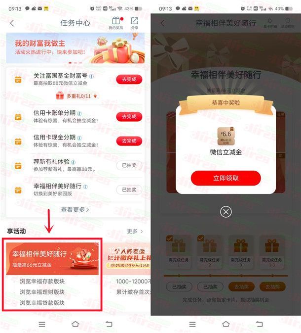 小编提示:打开中国工商银行APP,搜索【任务中心】进去,在享活动那里点击【幸福相伴美好随行】进去,完成3个简单的浏览任务可以抽奖4次,刚中11.6元(5元+6.6元),非必中
