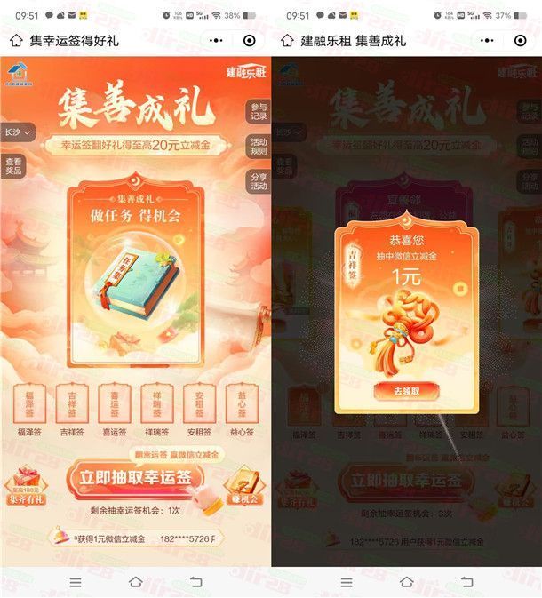 建融家园集幸运签活动抽1-100元微信立减金 亲测中1元