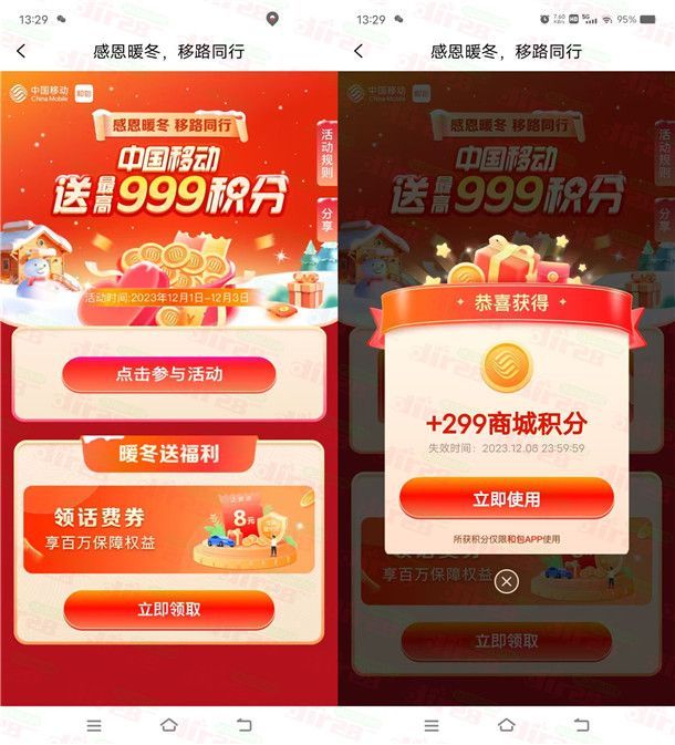 和包感恩暖冬领最高999个积分 亲测中299积分 价值3元左右