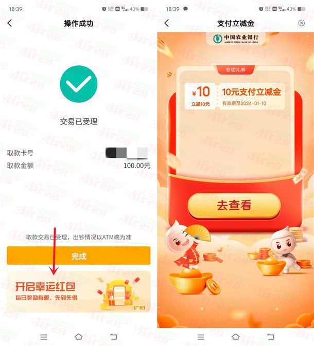 2、然后在任意一个线下农行ATM机,取款100元,选择扫码取款方式,再用你的中国农业银行APP扫描ATM机上的二维码完成取款,然后点击中国农业银行APP操作成功页面底部的图片【开启幸运红包】进去抽奖