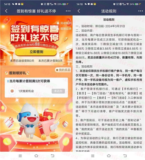 民生银行好礼送不停签到3天抽1-88元微信立减金 限量40万份